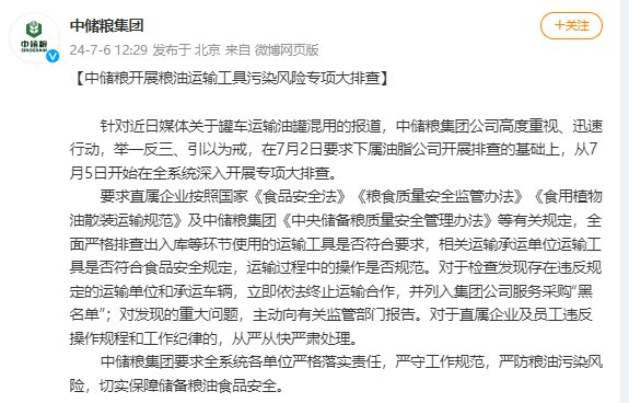 新京报讯 7月6日,中国储备粮管理集团有限公司官方微博@中储粮集团就罐车运输油罐混用事件发文回应。