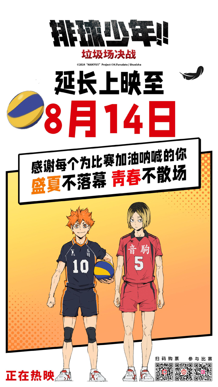 新京报讯 7月9日,电影《排球少年!!垃圾场决战》宣布上映时间将延长至8月14日。官博配文:“盛夏不落幕,青春不散场,属于排球少年们的热血故事还在继续!”该片于6月15日在中国大陆上映,截至发稿前票房为1.24亿。