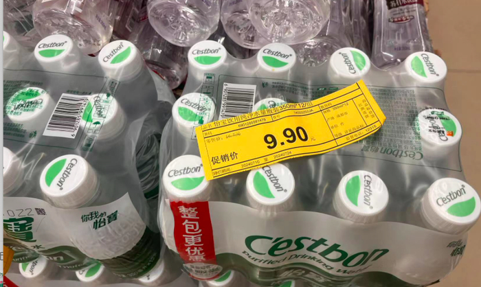 在连锁超市红旗连锁(002697.SZ)某门店内,农夫山泉红瓶饮用天然水原价18元/件,现促销价12.8元/件,每件规格为12瓶,一瓶550ml,折算下来单瓶价格约1.07元。同一门店的怡宝饮用纯净水原价16.5元/件,现促销价9.9元/件,每包规格为12瓶,一瓶350ml,折算下来单瓶价格约0.82元。