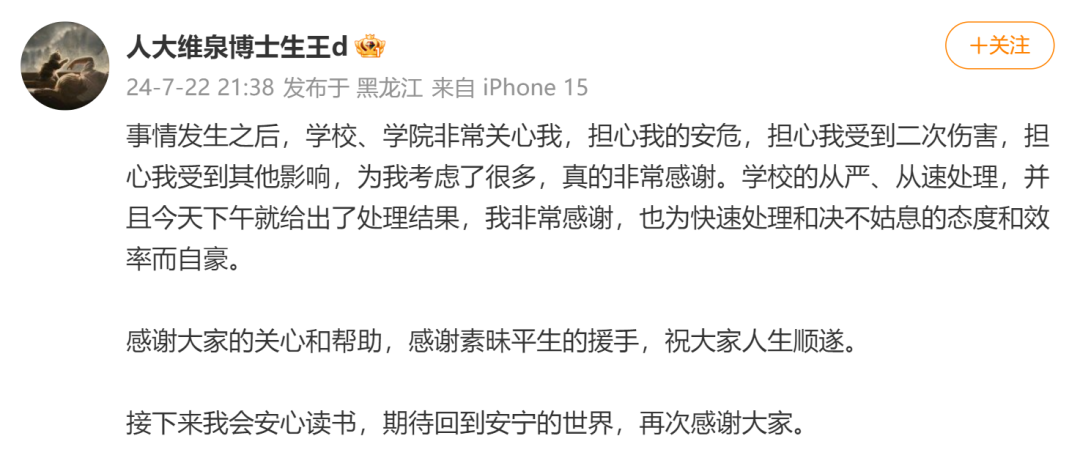 事情发生之后,学校、学院非常关心我,担心我的安危,担心我受到二次伤害,担心我受到其他影响,为我考虑了很多,真的非常感谢。学校的从严、从速处理,并且今天下午就给出了处理结果,我非常感谢,也为快速处理和决不姑息的态度和效率而自豪。