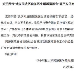 武汉同济医院7月22日发布的《关于网传“武汉同济医院某医生诱逼捐器官”等不实信息的声明》称,“近日网传‘武汉同济医院某医生诱逼捐器官’的言论,经相关部门核实查证,均为不实信息。我院严格遵守国家医疗相关规定积极救治患者;严格按照《人体器官捐献和移植条例》开展人体器官捐献和移植工作,对此不实信息的传播,我院保留依法追究法律责任的权利。”
