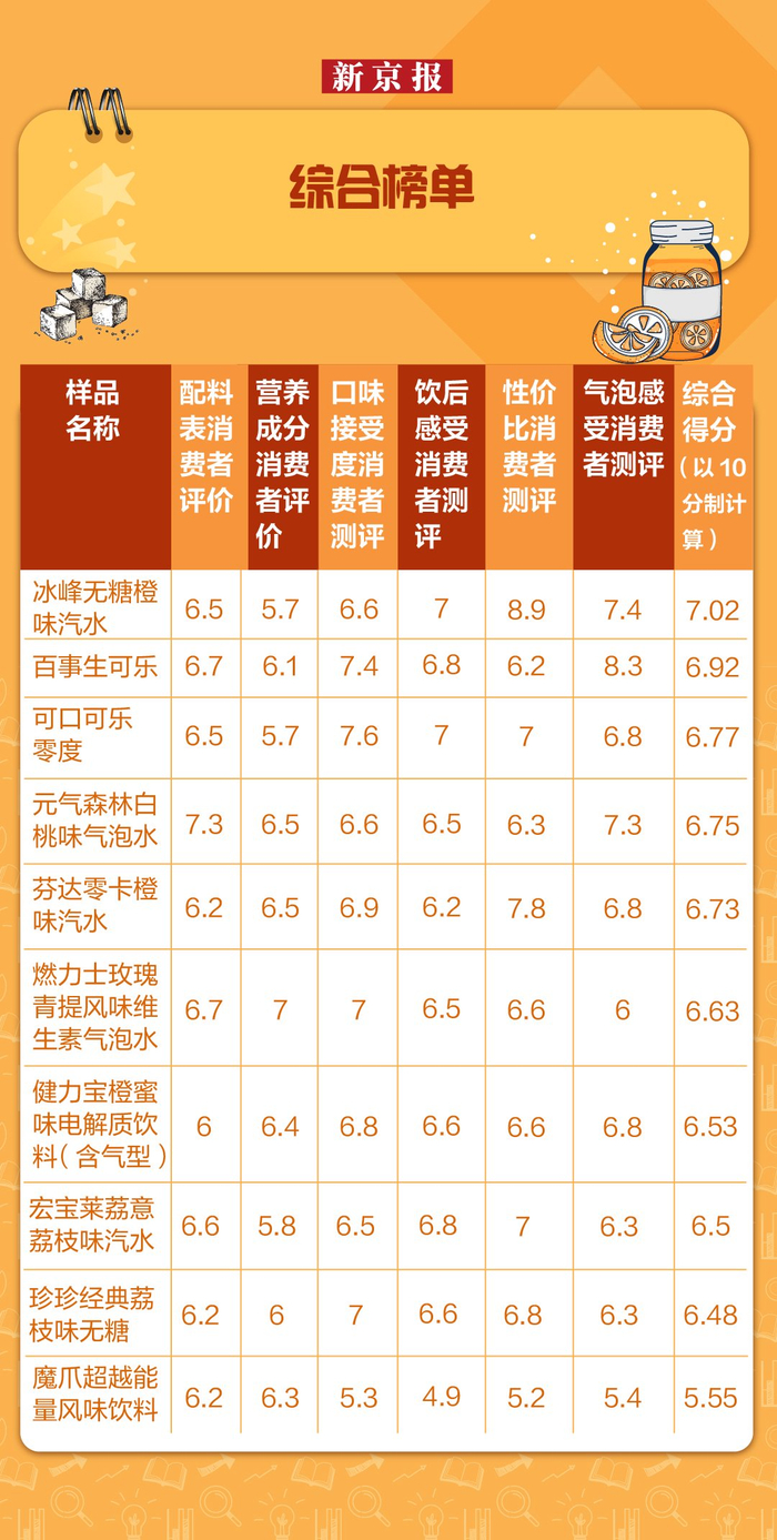 测评显示,冰峰无糖橙味汽水以价格、饮后感受度、气泡感等项目综合得分排第一。可口可乐零度、百事生可乐在口味接受度、代糖口味等方面较受消费者欢迎。魔爪超越能量风味饮料作为一款能量型饮料,口味、性价比、气泡感等方面在消费者测评中垫底,健力宝橙蜜味电解质饮料(含气型)配料表方面测评得分最低。总体而言,10款气泡水在各个项目有不同的表现,消费者更喜欢口味还原度高、气泡感充足的产品,配料表也越来越受消费者关注。