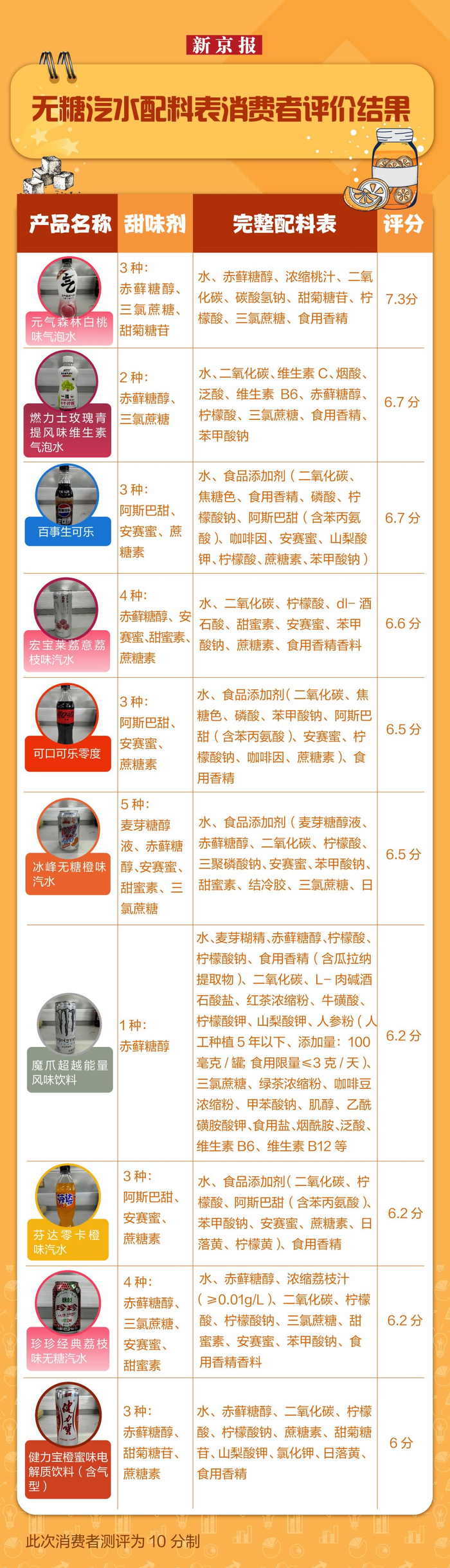 此次测评的10款无糖汽水,含甜味剂种类最多的是冰峰无糖橙味汽水,采用天然甜味剂麦芽糖醇液、赤藓糖醇以及人工合成甜味剂安赛蜜、甜蜜素、三氯蔗糖共5种甜味剂;甜味剂使用种类最少的是魔爪超越能量风味饮料,为赤藓糖醇1种甜味剂。
