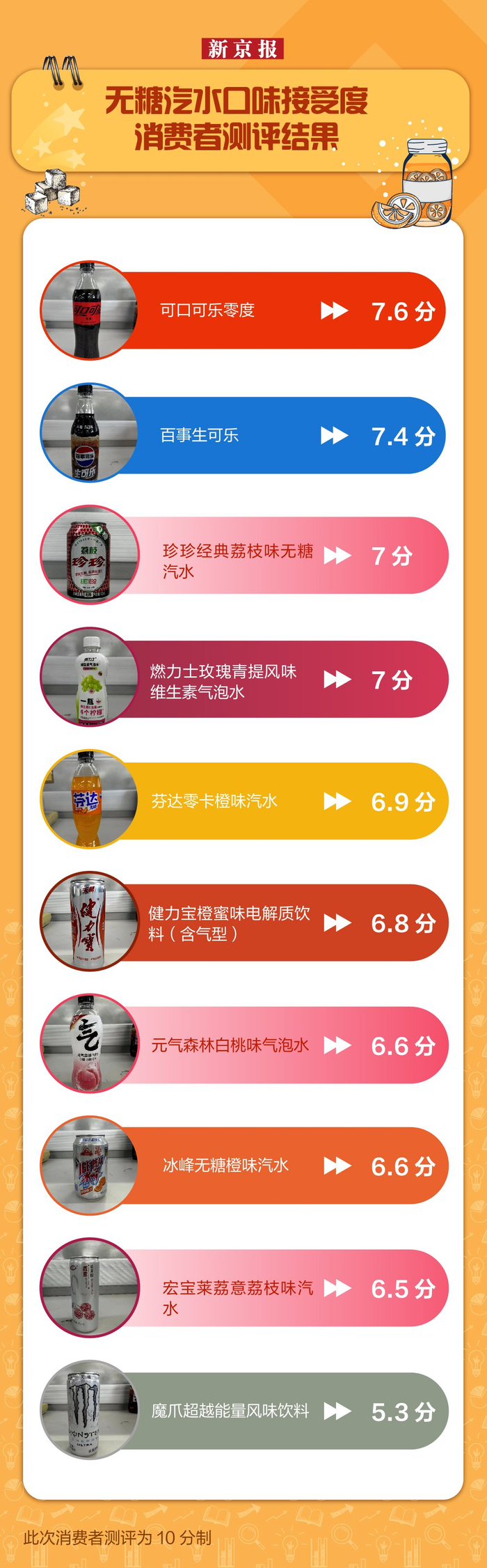 10款样本产品分别是:零度可口可乐、芬达零卡橙味汽水、元气森林白桃味气泡水、百事生可乐、冰峰无糖橙味汽水、健力宝橙蜜味电解质饮料(含气型)、魔爪超越能量风味饮料、宏宝莱荔意荔枝味汽水、珍珍经典荔枝味无糖汽水、燃力士玫瑰青提风味维生素气泡水。
