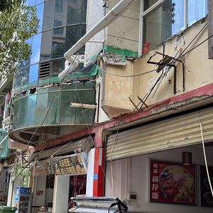 7月23日下午,澎湃新闻记者在事发现场看到,被围挡的7家店铺多是经营水果和餐饮业务。其中,坠落的招牌是5家商铺串联共用。招牌上方的两个大缺口露出了内部框架,一些裸露的板面和管道摇摇欲坠。围挡内的店铺均已停电停业,一些店员忙着向外搬运货物。两名穿着制服的工作人员在现场值守。