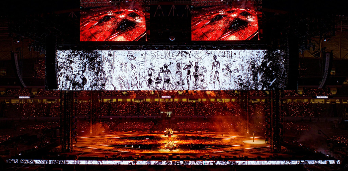 四面台的舞美设计结合音乐表达,做到了从远古来,到东方去。采用青铜、石器、陶瓷等作为创作背景与表现手段,将古代鸟兽、传统雕塑通过现代舞台科技进行创新表达,营造出传统而华丽的视觉效果,为歌曲增添不一样的氛围。演出过程中,四面台的四面大屏以拓印风格呈现三星堆文化元素,并用传统山水画风铺陈中式色彩,尽显东方韵味。四面台的外层设计了一层可升降的“珠帘屏”,根据不同歌曲风格进行视觉变换,贴合音乐表达。