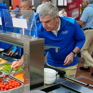 国际奥委会主席托巴赫在参观巴黎奥运村时尝试了沙拉。泰晤士报