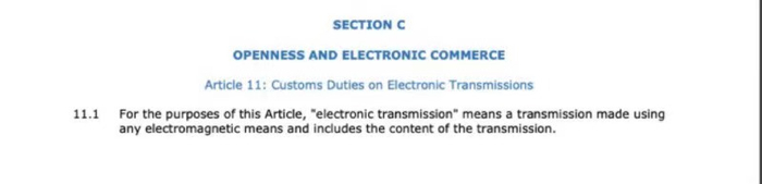 文本显示,其中包括“任何缔约方不得对一方人员与另一方人员之间的电子传输征收关税”等内容。