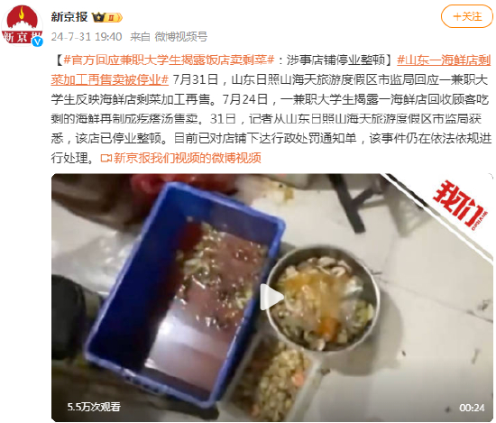 [官方回应兼职大学生揭露饭店卖剩菜:涉事店铺停业整顿]#山东一海鲜店剩菜加工再售卖被停业# 7月31日,山东日照山海天旅游度假区市监局回应一兼职大学生反映海鲜店剩菜加工再售。7月24日,一兼职大学生揭露一海鲜店回收顾客吃剩的海鲜再制成疙瘩汤售卖。31日,记者从山东日照山海天旅游度假区市监局获悉,该店已停业整顿。目前已对店铺下达行政处罚通知单,该事件仍在依法依规进行处理。