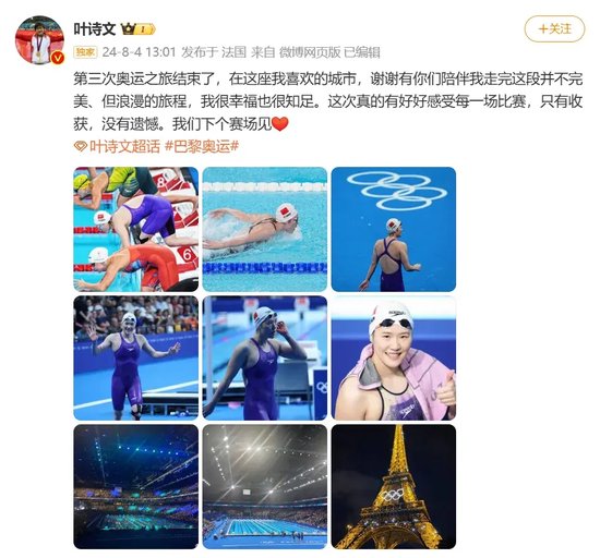 8月4日,三战奥运的叶诗文发文告别巴黎奥运会。