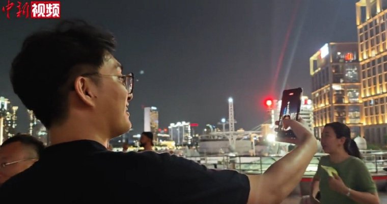 8月5日晚间,正在上海参访的台湾长风文教基金会青年参访团乘船夜游黄浦江。游船缓缓穿行,江风徐徐拂面,江岸两侧华灯璀璨,吸引青年拍照打卡。(记者 朱贺 制作 乐小敏)