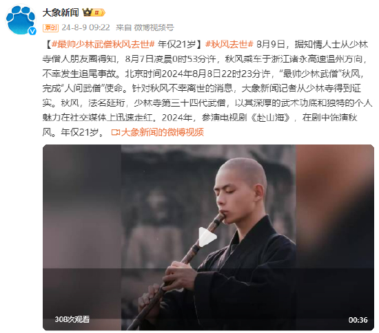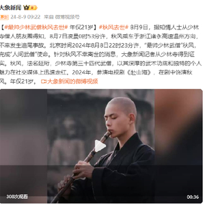 [#最帅少林武僧秋风去世# 年仅21岁]#秋风去世# 8月9日,据知情人士从少林寺僧人朋友圈得知,8月7日凌晨0时53分许,秋风乘车于浙江诸永高速温州方向,不幸发生追尾事故。北京时间2024年8月8日22时23分许,“最帅少林武僧”秋风,完成“人间武僧”使命。针对秋风不幸离世的消息,大象新闻记者从少林寺得到证实。秋风,法名延珩,少林寺第三十四代武僧,以其深厚的武术功底和独特的个人魅力在社交媒体上迅速走红。2024年,参演电视剧《赴山海》,在剧中饰演秋风。年仅21岁。