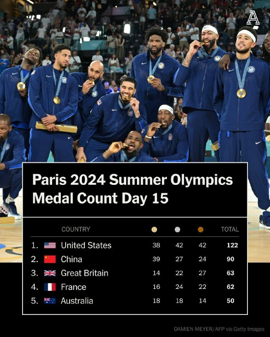 直播吧08月11日讯 巴黎奥运比赛日进入最后一天,美媒The Athletic晒出此前DAY15的奖牌榜。