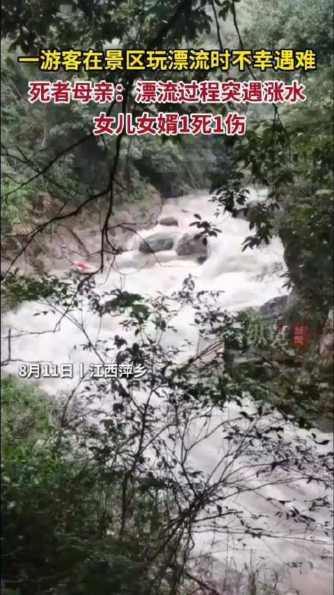 8月12日,多段内容相同的视频在网络传播,视频称,8月11日下午游客在江西武功山景区玩漂流时突遇涨水,有游客乘坐的漂流艇发生侧翻后被大水冲走。12日下午,纵览新闻记者联系上了被大水冲走亲人的游客王女士。王女士向纵览新闻记者称,被水冲走的是她的女儿和女婿,当晚女儿被找到时已不幸遇难,女婿则受伤住院。目前,他们在和景区方协商,还没有结果。
