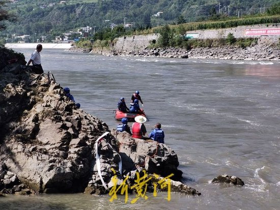 网传视频画面显示,有搜救人员身着潜水服拉着绳索潜入水中搜救,河面很宽,水流也很湍急。