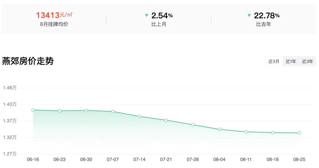 据安居客,8月燕郊二手房挂牌均价13413元/平方米,环比上月下降2.54%,同比下降22.78%。