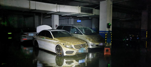 8月11日,积水退下去之后,顾先生冒着危险和救援人员一起进入了地库,当时地库内的积水还能没到脚踝。顾先生找到自己的车,发现爱车已经严重被淹,方向盘都泡在水里了,车几乎报废了。