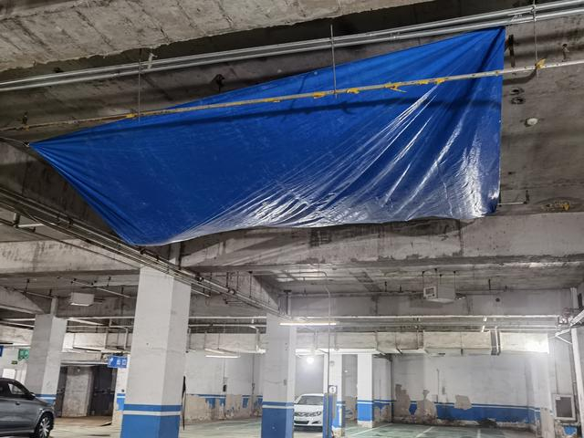 8月27日,记者来到明天第一城8号院地下车库,一走出电梯门外,入眼是水渍斑斑的墙面,散发着潮湿的味道。在5号楼下,车库屋顶悬着大块的蓝色毡布,外面是晴天,车库顶却哗啦啦下着“小雨”,地面上一摊一摊的积水,走廊里也全是积水,有居民用木板、沙袋做成小桥,才能勉强通过。