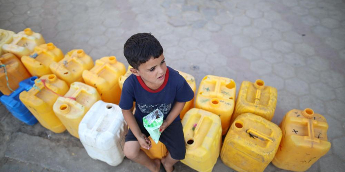 9月3日,在加沙地带中部的努赛赖特难民营,一名儿童坐在塑料桶上。新华社发(马尔万·达乌德摄)