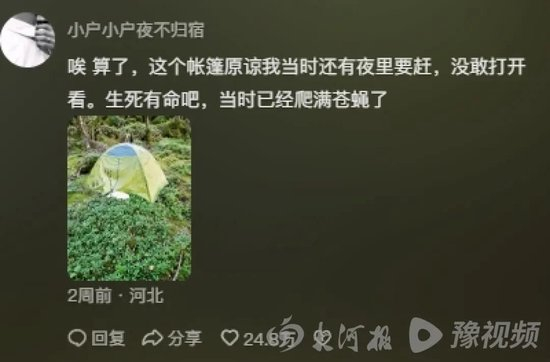 《看见》记者注意到,“猛蛇过江”的视频评论区中,网友“小户小户夜不归宿”回复称:“这个帐篷原谅我当时还有夜路要赶,没敢打开看,生死由命吧,当时已经爬满苍蝇了。”并配有一张上述帐篷照片,帐篷拉链还未被打开。