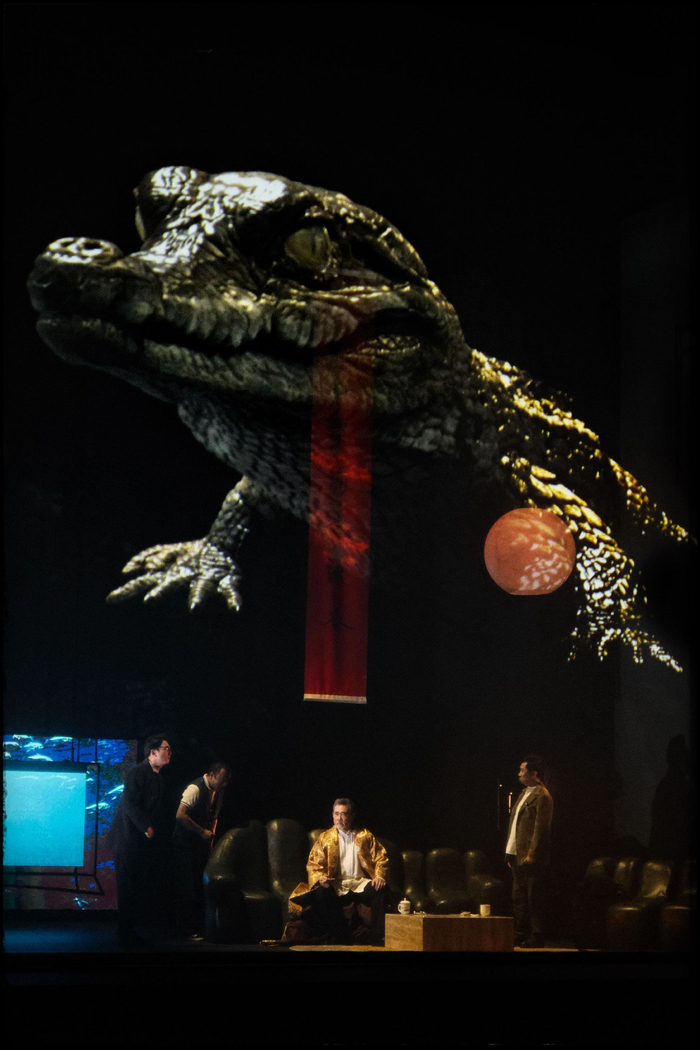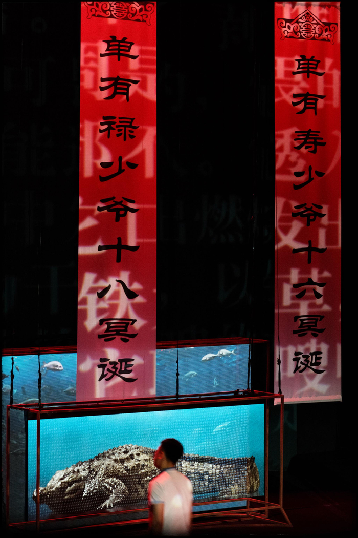 一条黑色、庞大的鳄鱼几乎从头到尾霸占着舞台布景的中央位置。