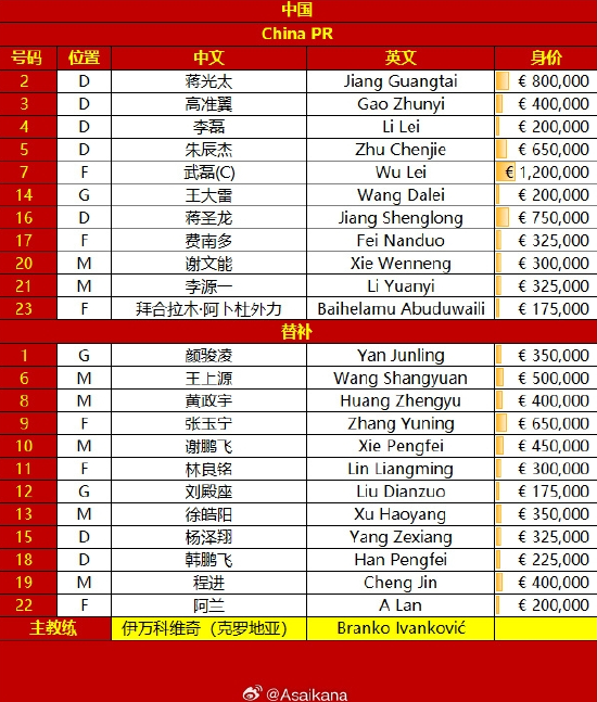国足替补:1-颜骏凌、12-刘殿座、6-王上源、8-黄政宇、9-张玉宁、10-谢鹏飞、11-林良铭、13-徐皓阳、15-杨泽翔、18-韩鹏飞、19-程进、22-阿兰