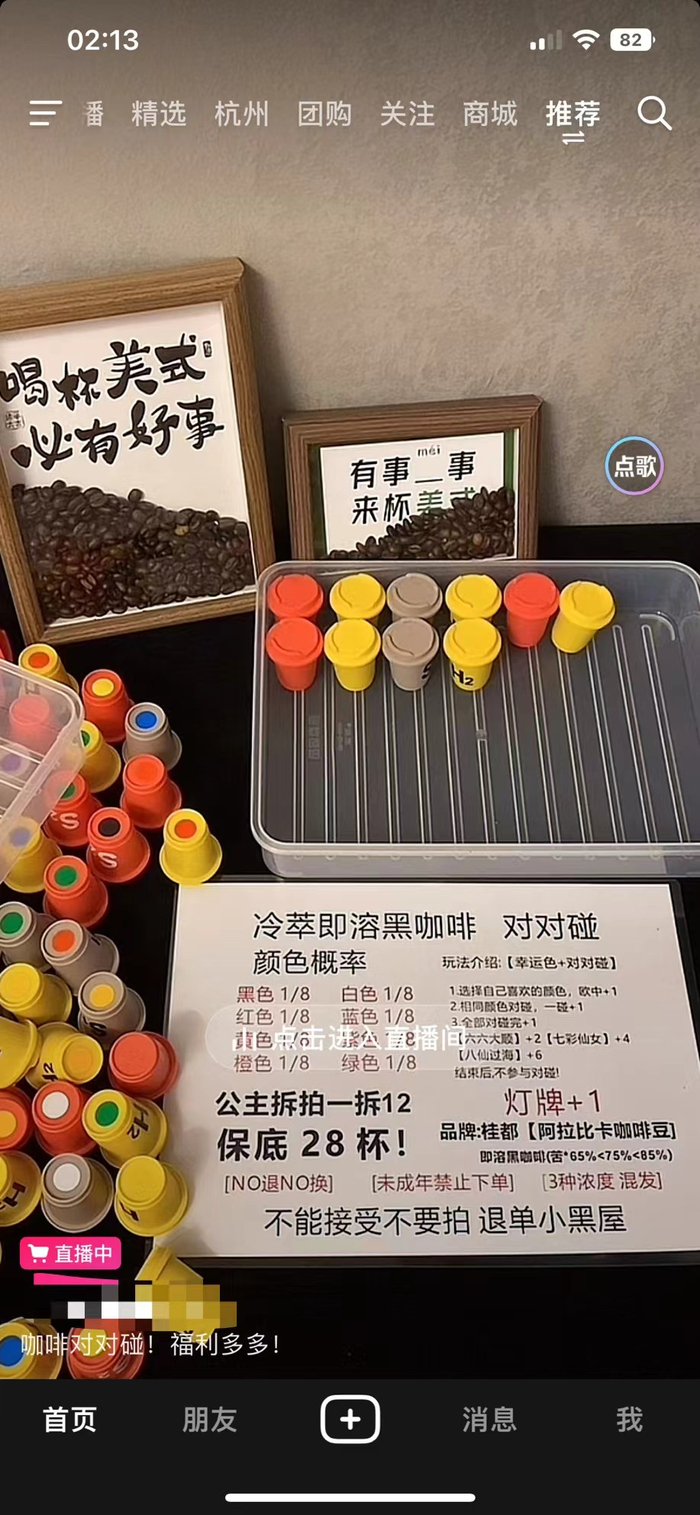 “20元就能拆8个咖啡盲盒。”主播不停地从刚拆开的袋子里拿出五颜六色的咖啡,“如果拆到同色就加拆1个,如果同色的出现3次就加拆2个。直到没有相同颜色的则停止游戏。”