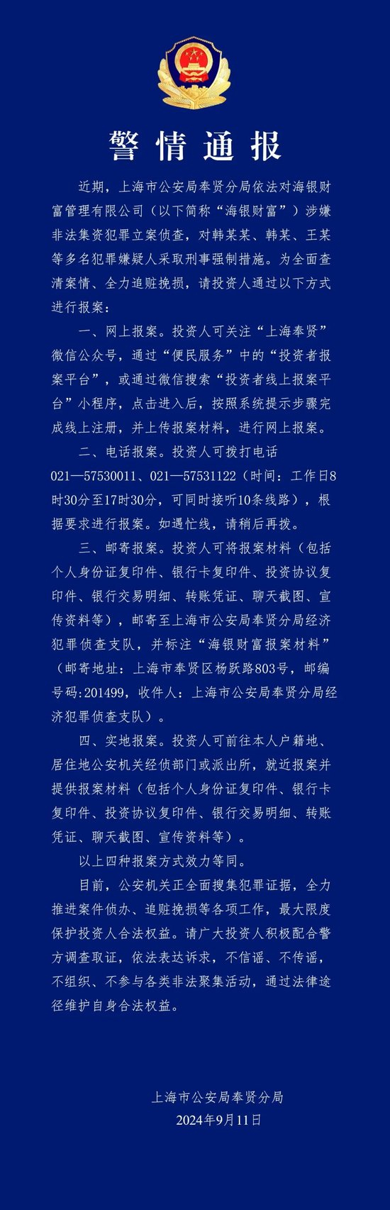 9月11日上午,上海市公安局奉贤分局对外发布,依法对海银财富管理有限公司涉嫌非法集资犯罪立案侦查,对韩某某、韩某、王某等多名犯罪嫌疑人采取刑事强制措施。目前公安机关正全面搜集犯罪证据,全力推进案件侦办、追赃挽损等各项工作,最大限度保护投资人权益。