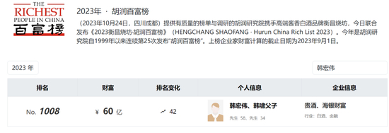 在2023年《胡润百富榜》上,韩宏伟、韩啸父子仍以60亿元身家上榜。