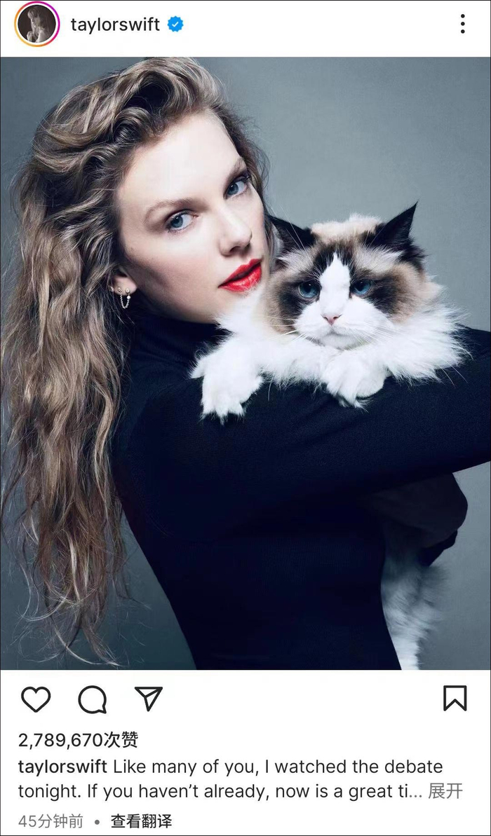 泰勒在帖文最后自称“无子女的爱猫女士”,还配上一张自己与爱猫的合照。