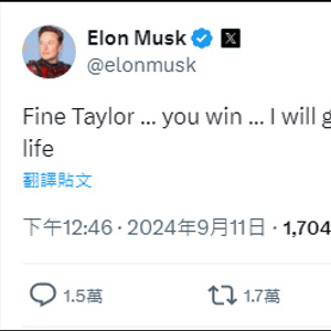 作为特朗普支持者的马斯克随后在其X账号表示:“好吧,泰勒……你赢了,我会给你一个孩子,并用生命守护你的猫。”