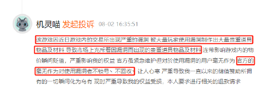本月,黑猫投诉平台接到多起针对DNF手游的投诉。用户反映,游戏内交易所出现漏洞,导致大量玩家利用漏洞制造贵重道具,市场上贵重物品泛滥,物价暴跌。尽管官方进行了紧急维护,但对违规玩家未采取有效措施,未封号也未回收非法道具,令正常玩家权益受损。多名玩家表示,其长期投资的游戏资产价值大幅缩水,要求官方退款。