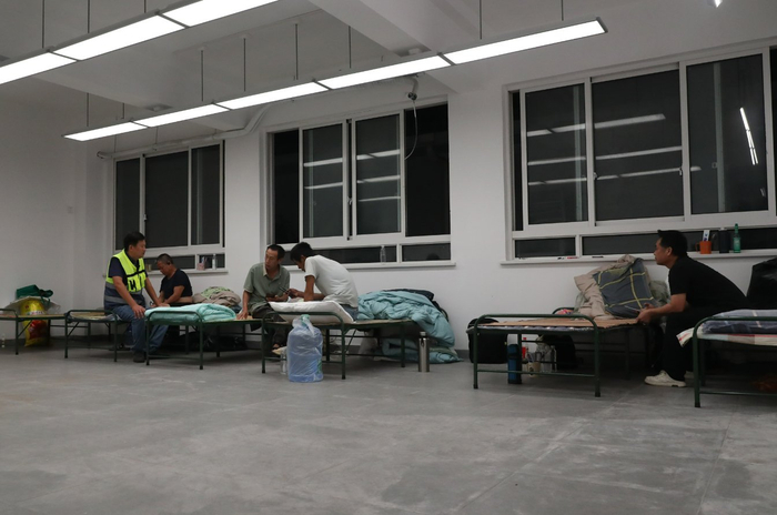 上海采取措施,提前准备,应对台风“贝碧嘉”。9月15日,在上海市浦东新区川南奉公路一处安置点,一名工作人员(左)在与临时安置的工人聊天。图片来源:新华社