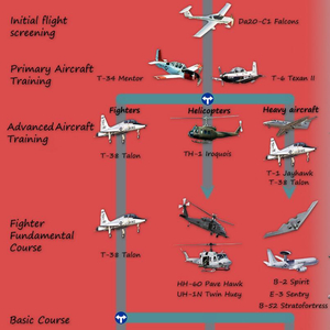 根据美国空军现行的飞行员培训流程,飞行学员要先在轻型通用飞机上进行18小时的飞行筛选,随后转到比奇T-6“德州人Ⅱ”涡轮螺旋桨教练机进行87小时基础飞行训练(以及47小时模拟器练习)。随后飞行员将根据培训方向分流各自进行高级飞行训练:战斗机、攻击机等战术飞机以及轰炸机飞行学员将在T-38C“禽爪”高级教练机上继续进行96小时飞行以及38小时模拟器练习(战斗机飞行员还需额外驾驶T-38C进行20小时战斗入门训练);直升机飞行学员将在TH-1“休伊”教练直升机上进行105小时的飞行以及40小时模拟器练习;运输/加油/特种机等学员则将在T-1A教练机上飞行76小时并在模拟器上练习54小时。之后便可以按照实战机型分配至相应的正式改装训练单位(Formal Training Unit,FTU,装备与作战部队实际使用型号一致的机型执行飞行员改装训练任务)。