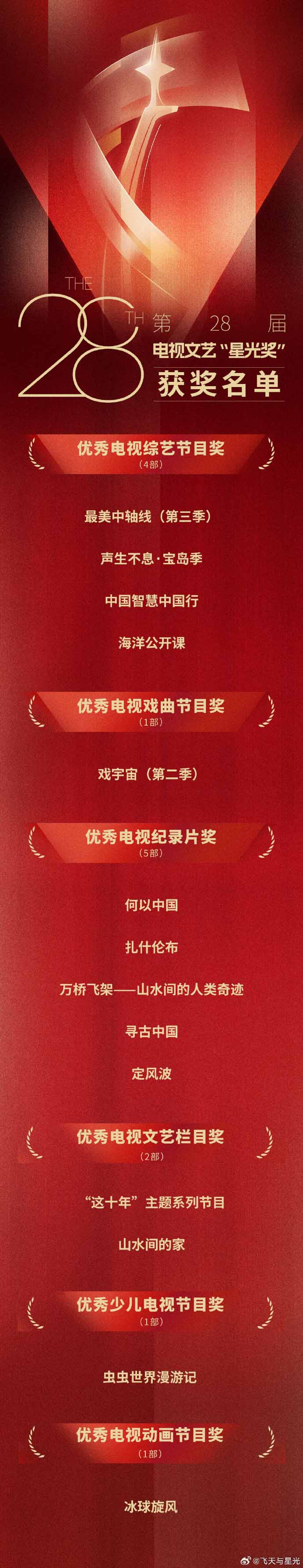 据中国电视艺术委员会官方微博(@飞天与星光)消息,飞天奖获奖名单如下: