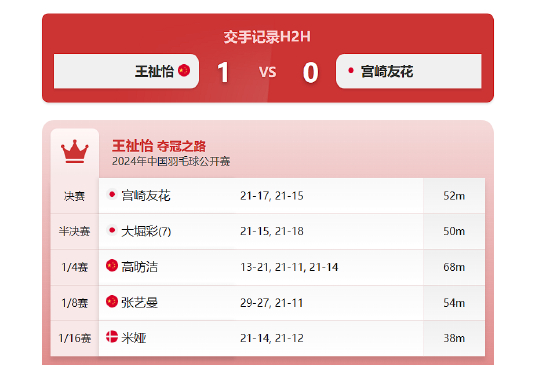 另据中羽在线:王祉怡21-17, 21-15宫崎友花,收获首次交手胜利,获得首座超级1000冠军,收获本赛季第4冠,也是职业生涯第6个羽联巡回赛女单冠军,是中国队时隔9年再次捧得中国公开赛女单冠军,上一次冠军是李雪芮于2015年获得。
