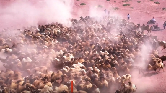 近日,新疆柯坪县的骆驼养殖户们,将1.5万峰骆驼赶往当地红沙漠聚集。骆驼们被编成10个驼群,沿着红沙河河岸疾行,步伐有力,驼铃阵阵,扬起阵阵沙尘。河道弯弯曲曲,驼群的队形随河道不停变化,场面十分壮观。