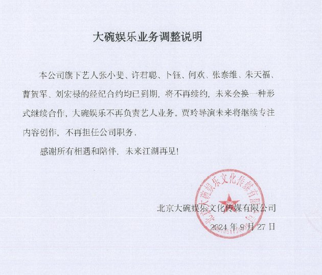 新京报讯(记者滕朝)9月27日,北京大碗娱乐文化传媒有限公司发布业务调整说明,公司旗下艺人张小斐、许君聪、卜钰、何欢、张泰维、朱天福、曹贺军、刘宏禄的经纪合约已到期,将不再续约,未来会换一种形式继续合作。贾玲未来将继续专注内容创作,不再担任公司职务。随后,贾玲、张小斐等转发表示:“我们来日方长。”