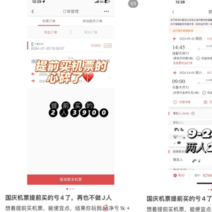 据界面新闻报道,在小红书、微博等社交媒体上看到,不少旅客发帖反馈,提前一两个月下单国庆节机票,结果节前一段时间查看票价,发现价格出现大幅下滑。