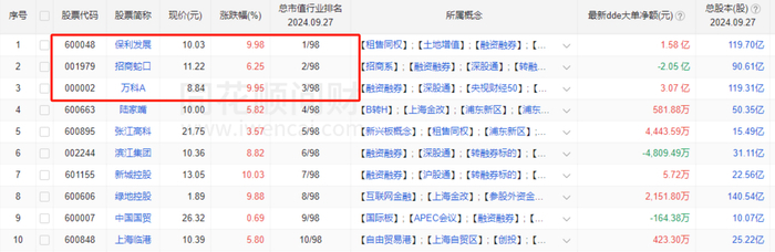 具体而言,9月27日收盘,特发服务领涨房地产板块,涨幅达20%。涨幅超过10%的个股共有13只,其中,信达地产上涨10.08%、城投控股上涨10.05%、我爱我家上涨10.03%。市值排名前三的房地产巨头亦展现出了强劲的市场表现,保利发展上涨9.98%、招商蛇口上涨6.25%、万科A上涨9.95%。