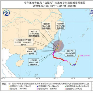 今年第18号台风“山陀儿”(强台风级)的中心今天下午5点位于台湾高雄市附近的海面上,中心附近最大风力达14级(45米/秒)。预计,“山陀儿”将于10月3日凌晨至中午在台湾岛西南部沿海登陆(台风级,12-13级,33-40米/秒)。