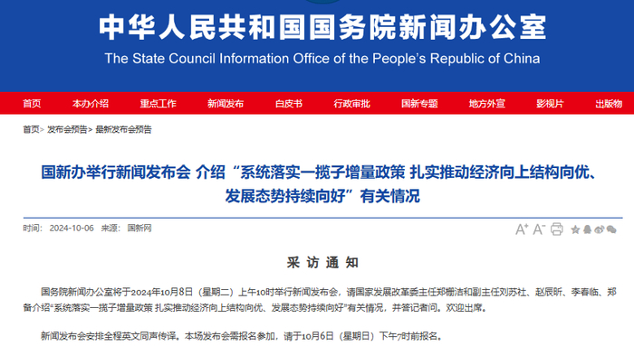 明日上午10时,国务院新闻办公室将举行新闻发布会,请国家发展改革委主任郑栅洁和副主任刘苏社、赵辰昕、李春临、郑备介绍“系统落实一揽子增量政策 扎实推动经济向上结构向优、发展态势持续向好”有关情况。