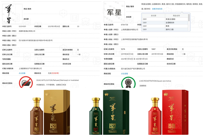 新京报记者查询中国商标网发现,上海贵酒已注册6件“军星”文字商标,其中可用于白酒产品的为第8784738号“军星”商标。其全资子公司成都军星酒业有限公司曾申请注册10件“军星”商标,但均未获批。