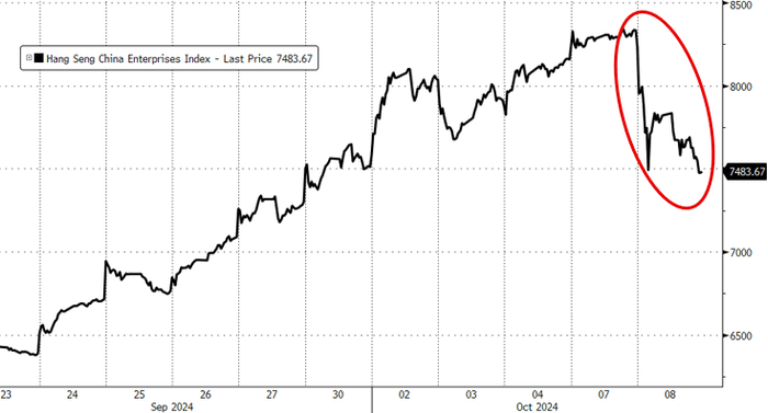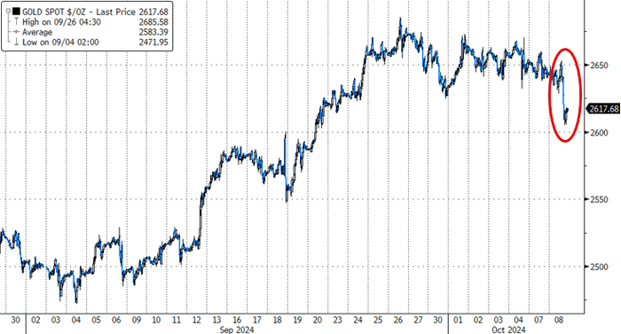 黄金:COMEX 12月黄金期货尾盘跌0.8%至2640.6美元/盎司。现货黄金美股盘前冲高涨近0.4%升破2650美元,随后加速下行,美股午盘最低跌超1.4%下逼2600美元。告别9月26日2685.42美元的历史高点,尾盘时跌0.79%,报2622.04美元/盎司。