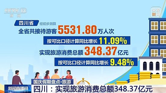 四川省经初步测算,全省共接待游客5531.80万人次,实现旅游消费总额348.37亿元,按可比口径计算,同比分别增长11.09%和9.48%。全省核心旅游景区“状态拉满”,17家5A级景区累计接待游客426.93万人次、实现门票收入1.85亿元,同比分别增长25.06%和15.48%,超越假日历史最高水平。九寨沟景区连续4天均达4.1万人承载量上限。