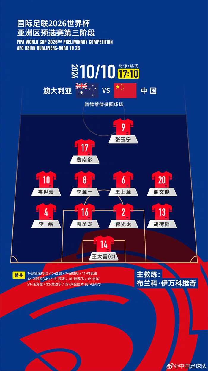 新京报讯 10月10日,2026世界杯亚洲区预选赛第三阶段第3轮,中国男足客场对阵澳大利亚队。中国队首发出炉,主教练伊万科维奇排出4411的阵型,锋线由张玉宁搭档费南多;中场李源一和王上源组成双后腰,韦世豪与谢文能分居左右;后卫线从左至右依次为李磊、蒋圣龙、蒋光太和胡荷韬;守门员为王大雷。