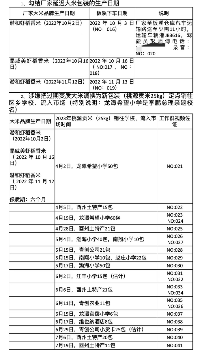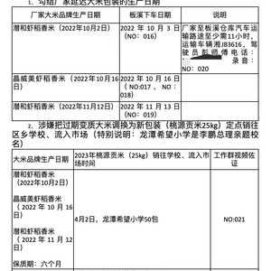根据举报人提供材料,2022年10月和11月生产的潜和虾稻香米和晶威虾稻香米在2023年4月到7月期间流向龙潭希望小学、渤海小学、南翔小学、龙潭官偿小学、江丰小学等多家单位,共计约416包,10.4吨。