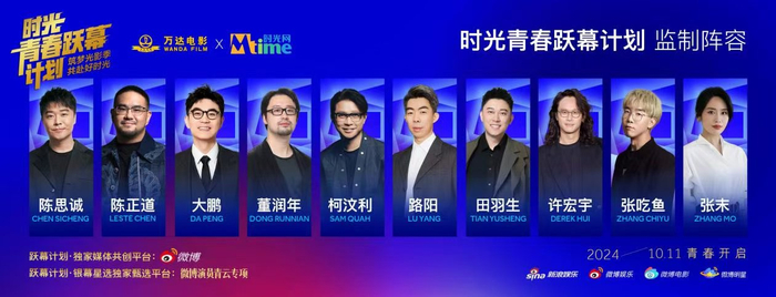 据悉,陈思诚(《唐人街探案》系列)、陈正道(《盛夏未来》)、大鹏(《保你平安》)、董润年(《年会不能停!》)、柯汶利(《默杀》)、路阳(《刺杀小说家》)、田雨生(《前任》系列)、许宏宇(《喜欢你》)、张吃鱼(《独行月球》)、张末(《拯救嫌疑人》)等著名导演确定将以监制身份加入“时光青春跃幕计划”,为年轻导演的创作之路保驾护航。