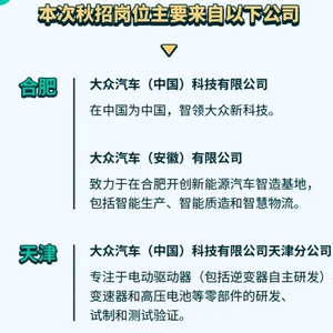 记者查阅大众智能电动汽车中心招聘微信公众号也看到,8月末以来,该账号发布有关大众汽车(中国)2025届校园招聘的消息,主要岗位来自合肥和天津。