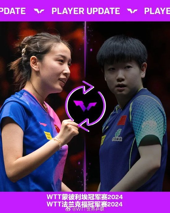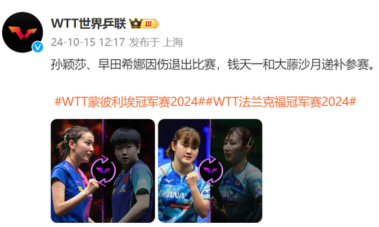另据@WTT世界乒联 10月15日中午消息,中国选手孙颖莎、日本选手早田希娜因伤将连续退出两站WTT冠军赛,分别为WTT蒙彼利埃冠军赛2024和WTT法兰克福冠军赛2024。